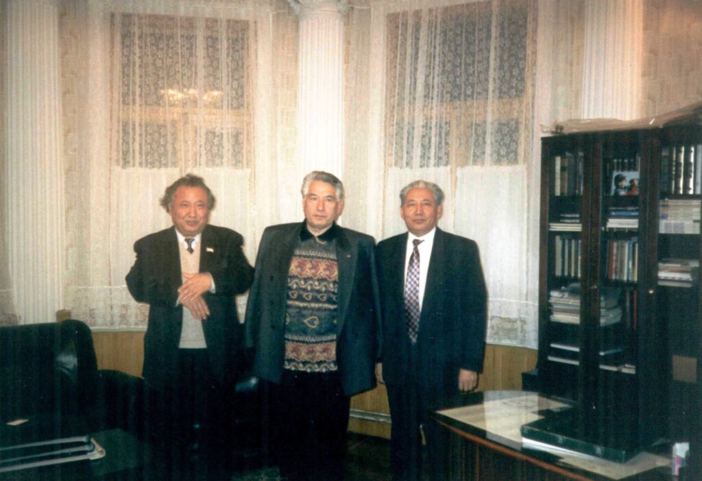 Жазушылар Шыңғыс Айматов және Әбіш Кекілбаевпен Абай Құнанбайевтың 150 жылдығына арналған ЮНЕСКО-ның ғылыми конференциясында , 1995 ж.